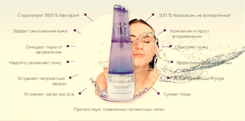 Коэффициент рН воды, насыщенной гидроксил-ионами, повышается, т.е. она становится более щелочной, а значит, повышаются ее антисептические свойства. При этом, в отличие от химических средств с подобными свойствами, жидкость из вашего водородного спрея совершенно безопасна и не вызовет аллергию или раздражение у вас на коже.